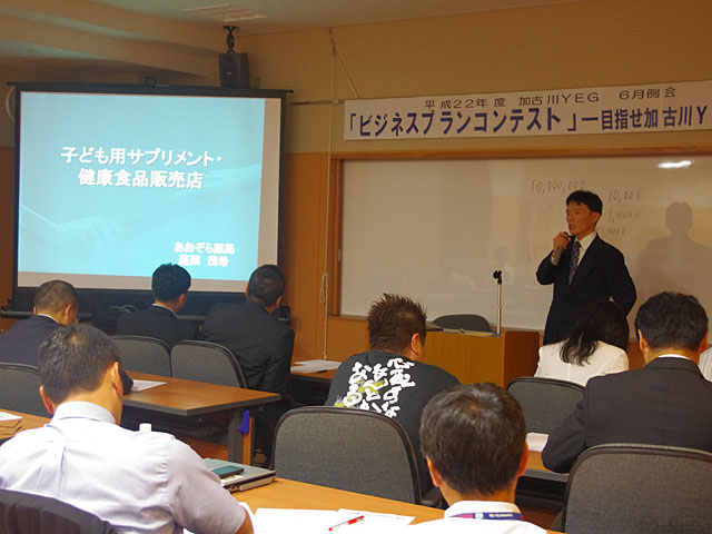 1.4月14日(水)から4月28日(水)までに青年部メンバー全員にビジネスプランコンテスト用紙にビジネスプランを考えてもらい、そのプランの中から商工会議所の経営指導員の方・大辻会長・藤川副会長・委員会で一次審査し、発表者を5月中旬頃までに4名決めました。2.一次審査での選考基準は社会性・実現可能性に重きを置きました。